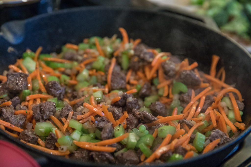 - Ajoutez l'huile de sésame, la sauce teriyaki, le gingembre et les épices pendant la cuisson des légumes et de l'ours.