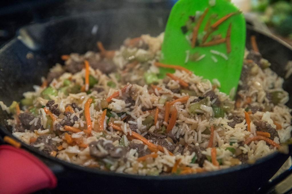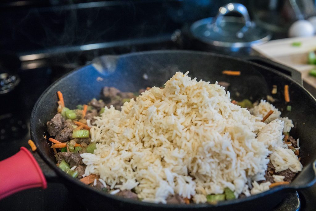 - Ajoutez le riz dans la poêle avec tous les autres ingrédients une fois qu'il a fini de cuire.