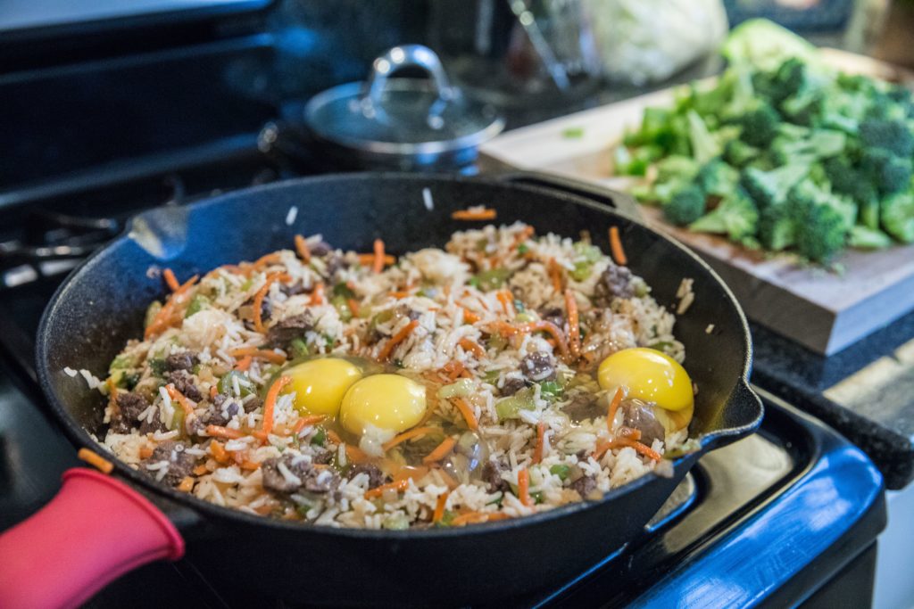 - Brouillez les œufs dans une poêle séparée ou dans la même poêle avec tous les autres ingrédients. (L'un ou l'autre fonctionne, mais j'ai trouvé plus facile de brouiller les œufs séparément, puis de les mélanger aux autres ingrédients).