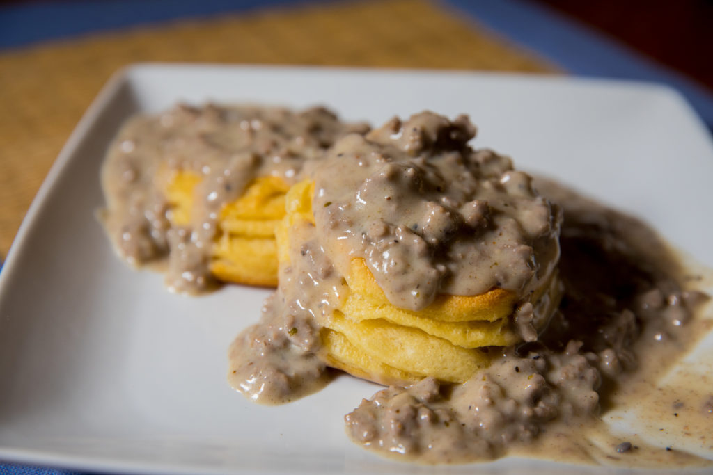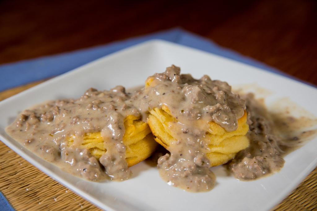 - Continuez à ajouter du lait et de la farine pour obtenir la consistance souhaitée pour la sauce. Remuez constamment le mélange. La sauce ne doit pas être fine, mais elle doit être suffisante pour couvrir la viande et s'écouler facilement sur les biscuits.