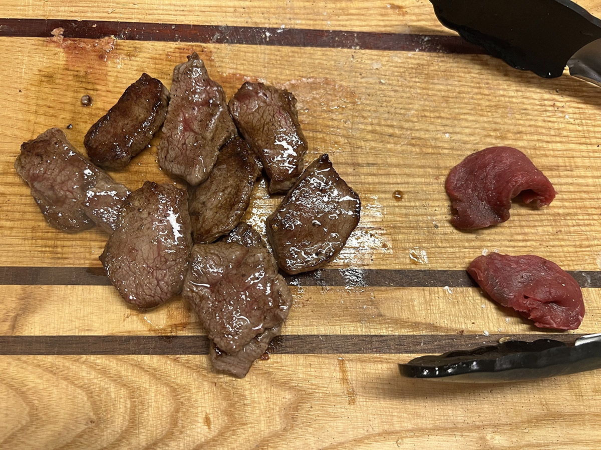 - Utilisez n'importe quel morceau tendre de venaison (j'ai utilisé un filet arrière) et coupez-le en fines tranches pour obtenir des bouchées d'environ 1″ x 1″.