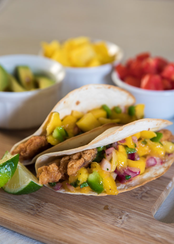 - Préparez des tacos comme vous le souhaitez, avec les ingrédients de votre choix, et garnissez-les de salsa à la mangue !