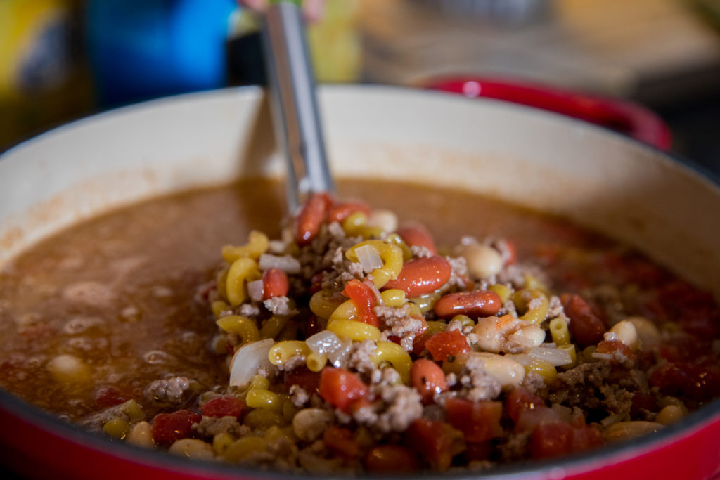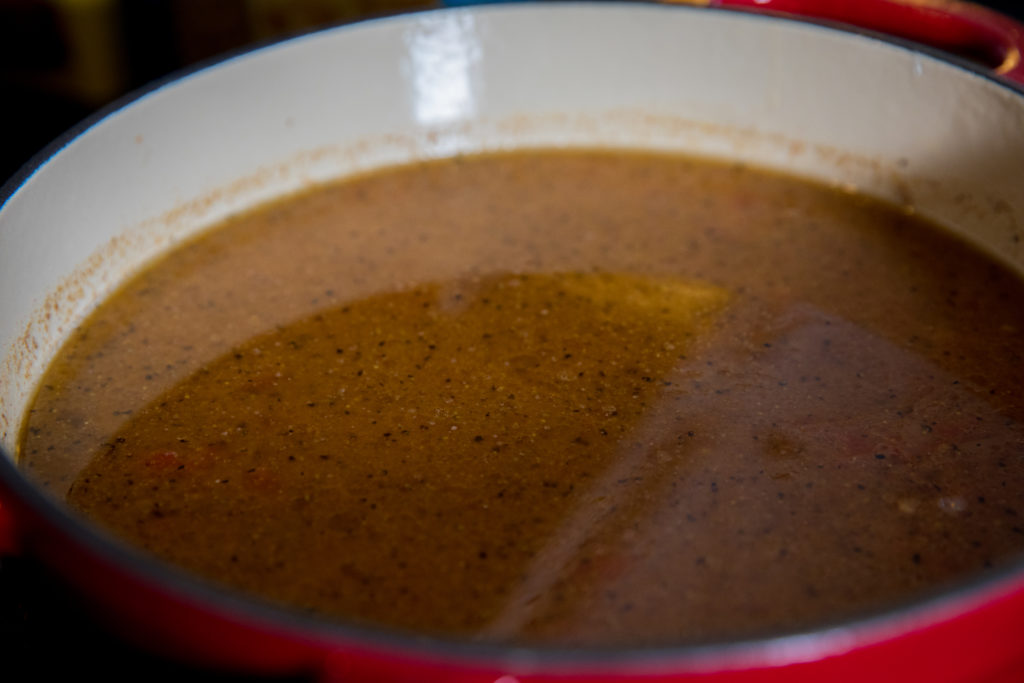 - Baisser le feu à moyen-doux et ajouter les tomates en dés, les haricots rouges, les haricots blancs, le poivre, la sauce Worcestershire et le bouillon de poulet. Portez à ébullition.