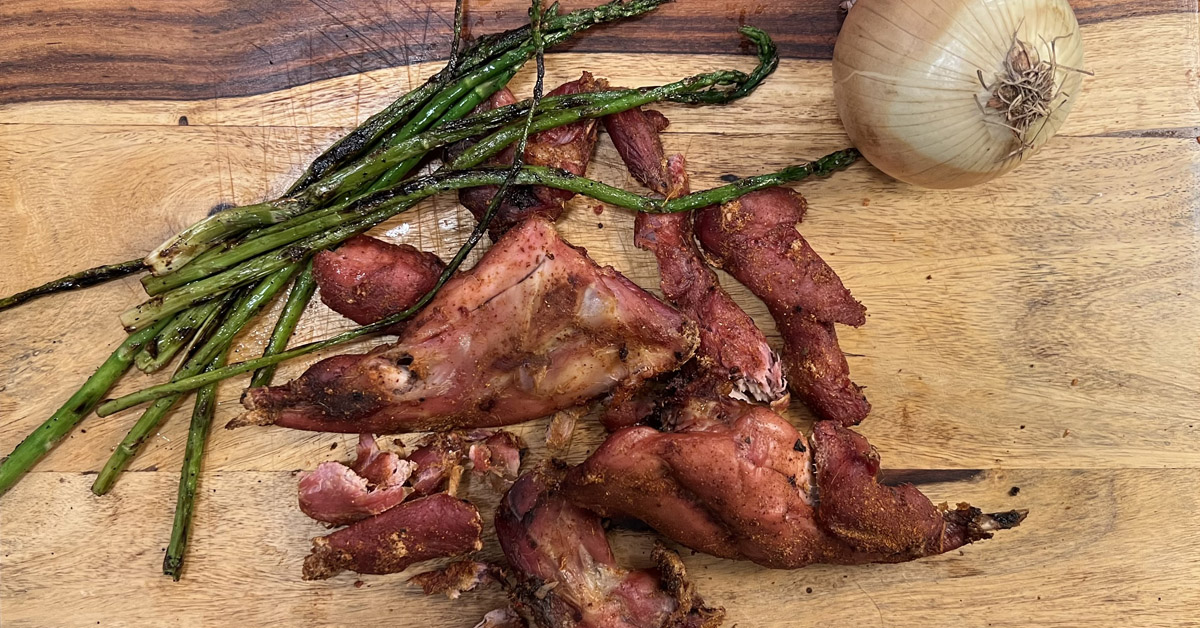 - Les asperges grillées avec de l'huile d'olive, du sel, du poivre et du paprika sont un excellent accompagnement pour le lapin fumé.