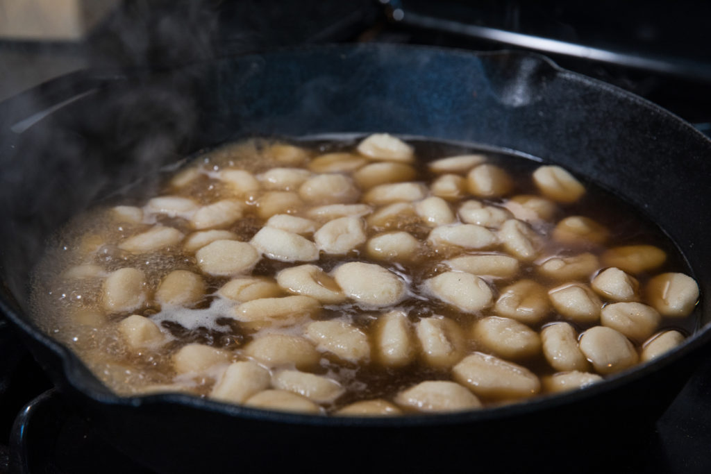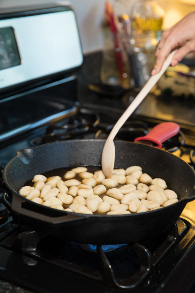 - Dans une poêle, faites cuire les gnocchi selon les instructions de l'emballage, mais dans du bouillon de poulet plutôt que dans de l'eau.