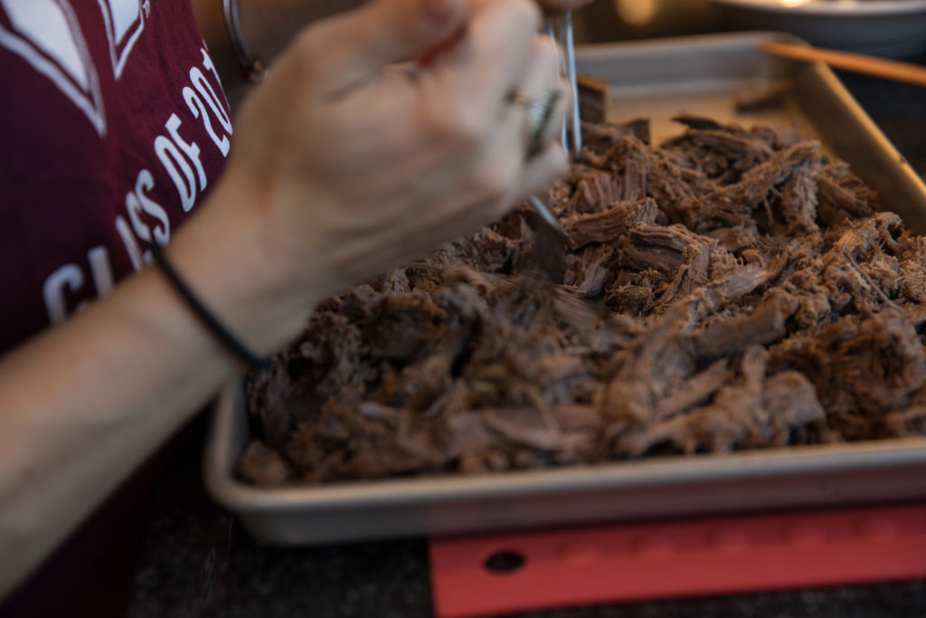 - Détachez le rôti jusqu'à ce que toute la viande soit déchiquetée et ajoutez la sauce BBQ. Mélangez bien à la viande râpée. Laissez mijoter pendant quelques heures.