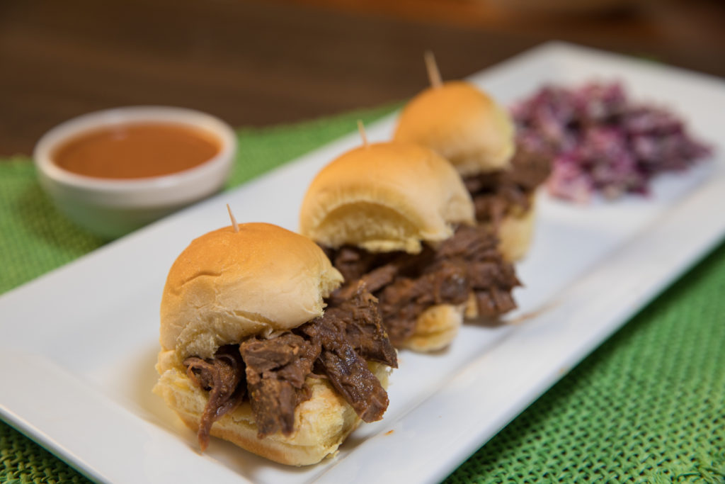 - Servez le barbecue sur les mini-rouleaux de pommes de terre et garnissez de salade de chou. Arrosez de sauce BBQ supplémentaire.