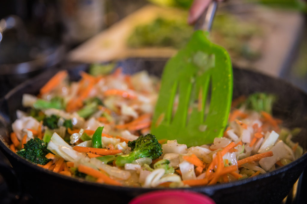 - Dans une poêle avec de l'huile d'olive, à feu moyen, ajoutez le brocoli, le chou, l'oignon, les carottes et faites-les revenir jusqu'à ce qu'ils soient tendres. Ajouter l'huile de sésame, la sauce teriyaki, la sauce soja et les épices aux légumes.
