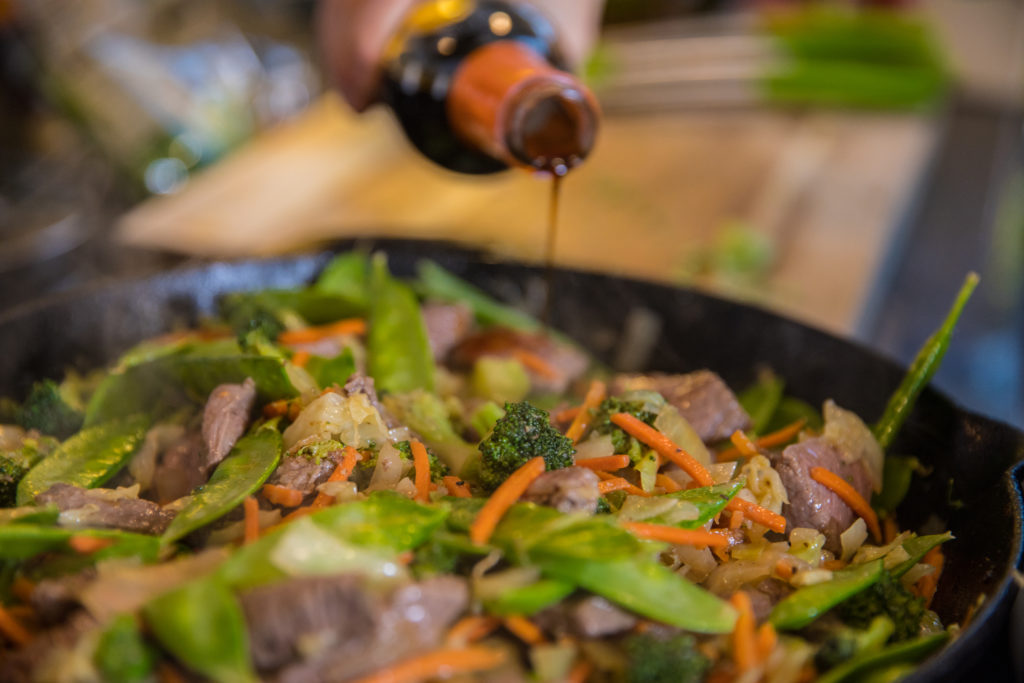 - Ajoutez le filet dans la poêle et continuez à mélanger les ingrédients jusqu'à ce qu'ils soient bien combinés à feu moyen-doux. Ajoutez de la sauce teriyaki, de la sauce soja et des épices à votre convenance.