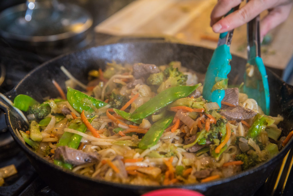 - Ajoutez les nouilles dans la poêle et mélangez tous les ingrédients jusqu'à ce qu'ils soient bien combinés. Pas trop longtemps cependant, vous ne voulez pas trop cuire la venaison ou les nouilles. Probablement 1-2 minutes.