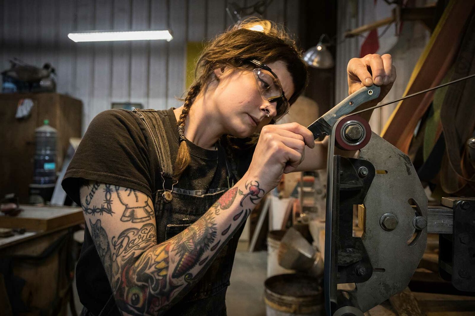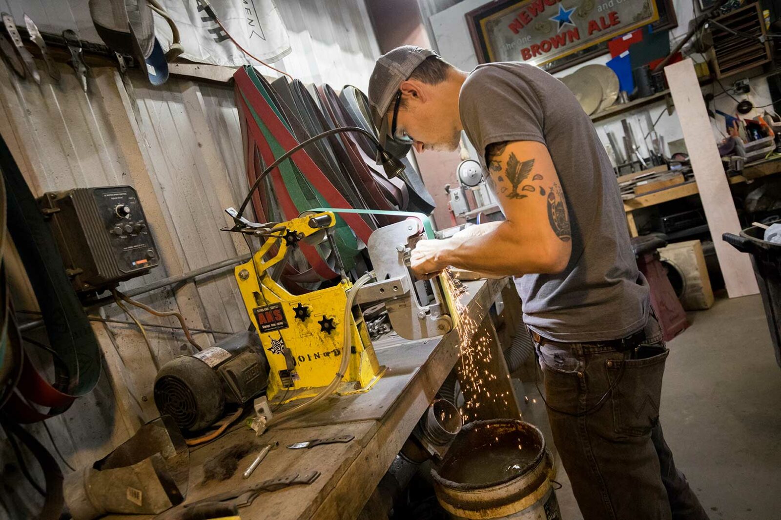 "Tous nos couteaux et étuis sont fabriqués à Richmond avec des matériaux de première qualité. Nous effectuons tous les traitements thermiques sur place et nous fabriquons notre propre acier damassé.