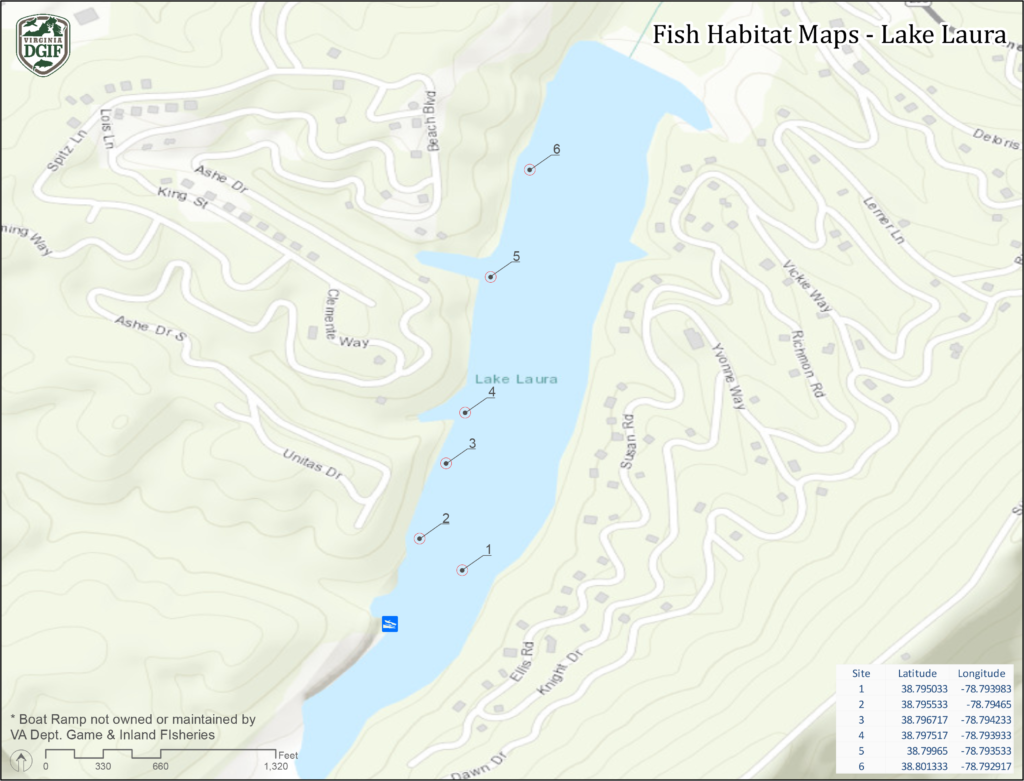 Le lac Laura est une retenue d'eau de 44acres située dans le sud-ouest du comté de Shenandoah, près de la frontière de l'État de Virginie-Occidentale. Le lac appartient au Bryce Mountain Resort et le Department of Wildlife Resources a commencé à gérer la pêcherie à l'adresse 1991. Le barrage retient les eaux d'amont de Big Stony Creek, créant un bassin de forme rectangulaire d'une profondeur maximale de 30 pieds. Le lac Laura a déjà connu des proliférations d'algues nuisibles et une végétation aquatique surabondante. Pour remédier à cette situation, Bryce Mountain Resort a dragué l'extrémité supérieure de la retenue en enlevant les sédiments chargés de nutriments et en augmentant la profondeur de l'eau, ce qui limite les conditions de croissance de la végétation. Des carpes triploïdes ont également été stockées pour maintenir la végétation aquatique à des niveaux souhaités. Les pêcheurs ont la possibilité de pêcher l'achigan à grande bouche, le crapet-bleu, le crapet-soleil, la perche jaune, la barbue de rivière et le maskinongé.