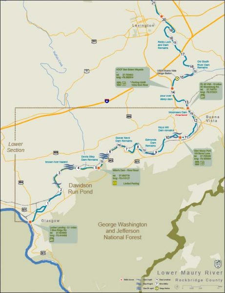 Une excursion idéale pour la pêche à l'achigan et au poisson-lune pourrait commencer à l'aire de mise à l'eau du parc Glen Maury à Buena Vista et se terminer à Locher Landing du Department of Wildlife Resources près de Glasgow. Il s'agit d'un parcours de 12miles et même une longue journée d'été ne vous laissera pas assez de temps pour le parcourir en entier. Il suffit de se ménager et de ne pêcher que dans les eaux les plus productives. Si vous êtes intéressé par des excursions plus courtes vous permettant de parcourir l'eau de manière plus approfondie, adressez-vous à Glenn Rose de James River Basin Canoe Livery, Ltd, R.F.D. 6, Box 125, Lexington, Va. 24450Téléphone : 540-261-7334. Il a passé plus de 20 ans sur le Maury et le connaît sur le bout des doigts. Il pourra probablement vous donner des conseils concernant l'entrée et la sortie de la rivière. Il dispose également d'un site Internet qui regorge d'informations et de liens utiles, à l'adresse CanoeVirginia.com.