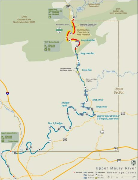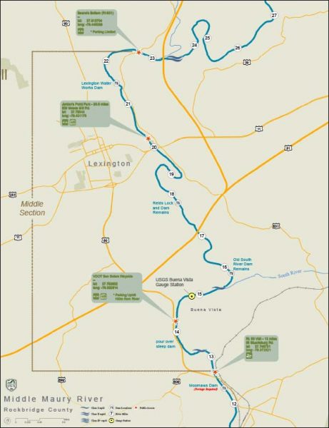 - Basses eaux : La rivière Maury devient difficile à naviguer lorsque le débit du cours d'eau est inférieur à 2.0 feet at the Buena Vista USGS Gage.