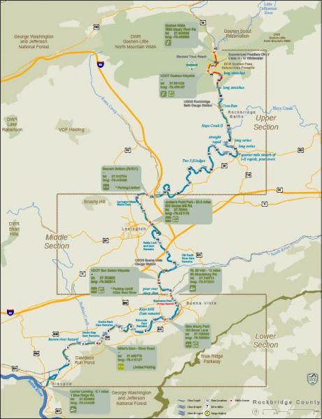 Respectez la propriété privée. Depuis le bas de Goshen Pass, près de Rockbridge Baths, jusqu'à la confluence avec la rivière James (à l'exception des points d'accès publics représentés sur cette carte), les deux rives de la rivière sont des propriétés privées, situées au-dessus de la ligne moyenne des hautes eaux. Demandez toujours l'autorisation du propriétaire avant de traverser ces propriétés. L'obtention de l'autorisation des propriétaires privés pourrait permettre d'accéder à d'autres tronçons de la rivière pour pagayer ou pêcher.