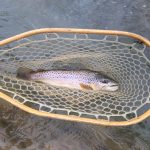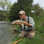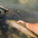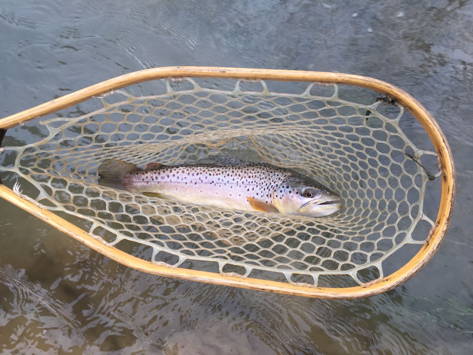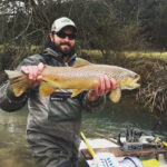 Alex McCrickard, coordinateur de l'éducation aquatique du DWR, avec une truite brune 18" capturée sur la section publique de Mossy Creek.