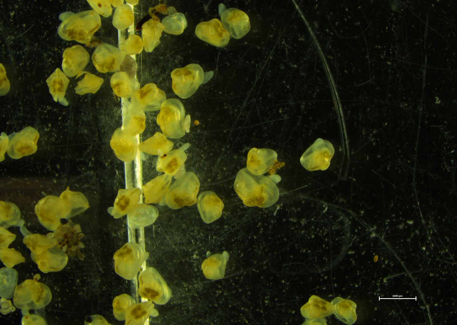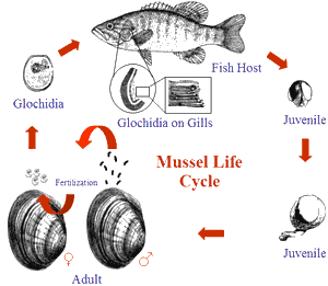 Le cycle de vie de la moule d'eau douce est l'un des plus complexes et des plus intéressants du monde animal. Contrairement à d'autres animaux qui peuvent rechercher activement un partenaire, la moule sédentaire dépend du courant de la rivière pour se reproduire. Le processus commence par la libération du sperme par le mâle, et la femelle située en aval l'aspire par son siphon incurrent. Les œufs fécondés, qui se comptent par centaines de milliers sur le site 100, se transforment en glochidies à l'intérieur de ses branchies. Une fois arrivés à maturité, ils sont relâchés dans la colonne d'eau pour entamer la deuxième partie de leur vie : ils se fixent aux branchies, aux nageoires ou aux écailles des poissons d'eau douce. À ce stade, le processus se complique encore, car non seulement les glochidies doivent trouver un poisson, mais celui-ci doit faire partie de quelques espèces de poissons spécifiques pour que le cycle de vie se poursuive. Si un glochidium s'attache à la bonne espèce de poisson, il s'enkyste dans les tissus du poisson et vit une courte vie de parasite.