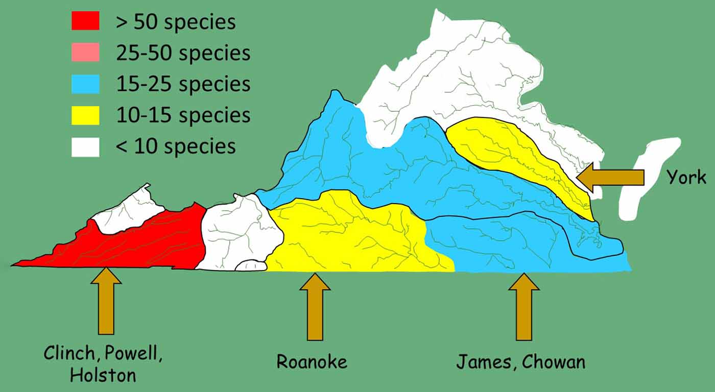 La diversité des moules d'eau douce aux États-Unis est inégalée. Sur les quelque 1,000 espèces recensées dans le monde, les États-Unis abritaient historiquement 304, environ 1/3rd de l'ensemble de la faune mondiale. Par rapport à d'autres pays et continents comme l'Afrique avec 96 espèces, la Chine avec 60 espèces, et l'Europe avec un maigre 12 espèces, la richesse des États-Unis devient vraiment impressionnante. La plus grande partie de cette diversité se trouve dans les bassins versants du sud-est des rivières Ohio, Tennessee, Cumberland et Mobile. L'un des bassins hydrographiques les plus diversifiés, le Tennessee contient 102 espèces, soit près de 1/3rd de la faune du pays ! La Virginie fait partie de l'équation car les sources de la rivière Tennessee se trouvent dans la région sud-ouest de l'État. La partie du bassin versant de la rivière Tennessee qui appartient à la Virginie comprend les rivières Powell, Clinch et Forks of the Holston (North, Middle et South). Dans ces rivières, on trouve actuellement plus de 45 espèces de moules, dont plusieurs ne se trouvent nulle part ailleurs que dans le bassin hydrographique supérieur du Tennessee.