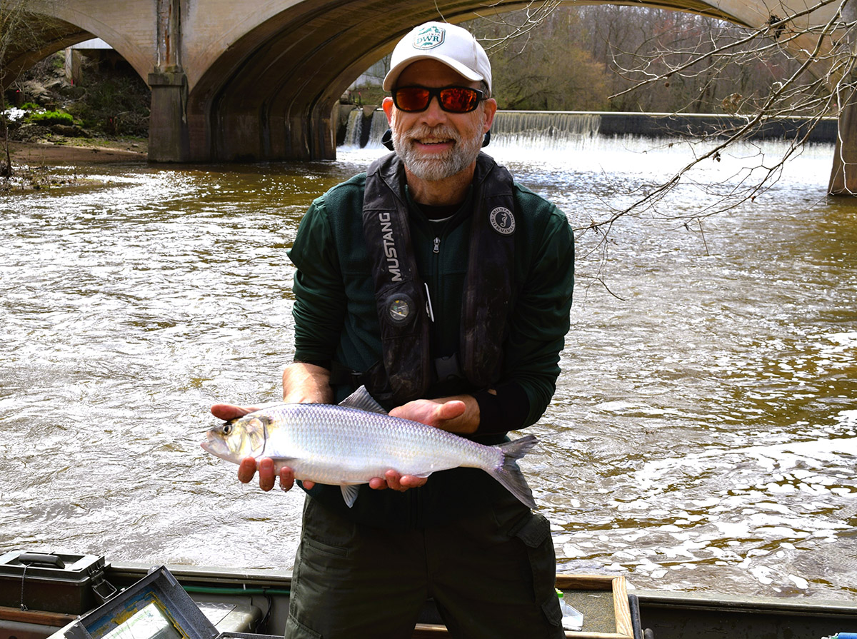 Alan Weaver, coordinateur du passage des poissons en Virginie, montre une alose feinte capturée lors d'une étude sur les poissons anadromes. ©Photo de Melinda Weaver