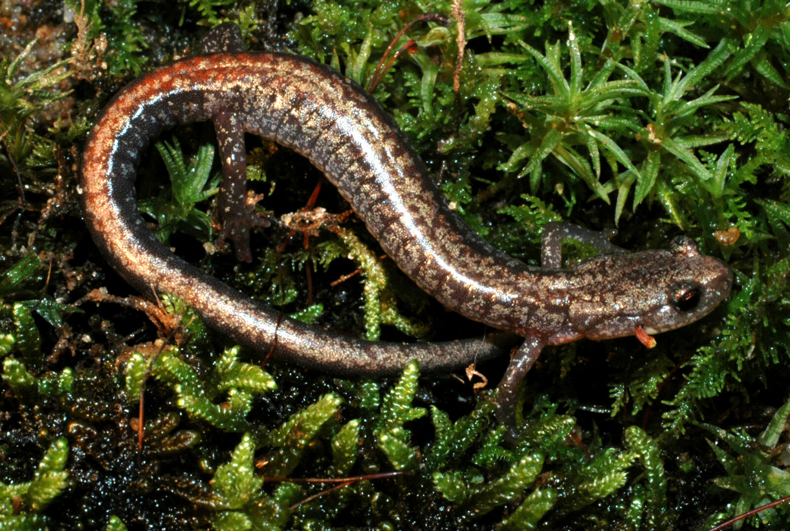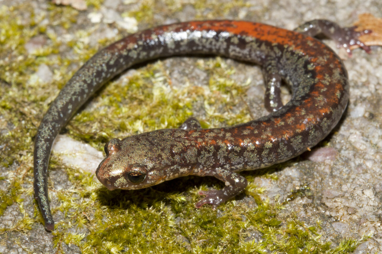 Semblable à la salamandre à dos roux, mais avec une tête plus large et des membres plus longs. Le corps est gris foncé à noir avec de petites taches blanches sur les côtés. Le ventre est généralement plus blanc que noir et la bande sur le dos est souvent moins rouge que chez la salamandre à dos roux. Il y a des phases avec et sans bandes.