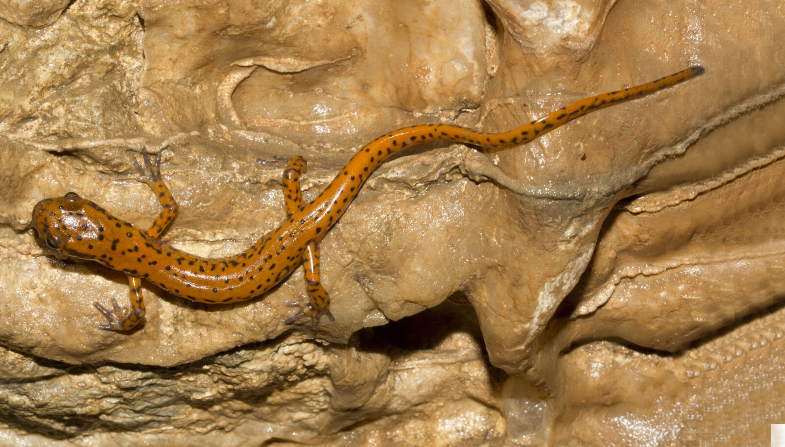 La salamandre des cavernes est une grande salamandre orange à rouge orange avec de petites taches noires sur le dos et les côtés. La queue peut représenter plus de la moitié de la longueur totale du corps. La tête est plus large et plus plate que chez la salamandre à longue queue, et les pattes sont plus longues.