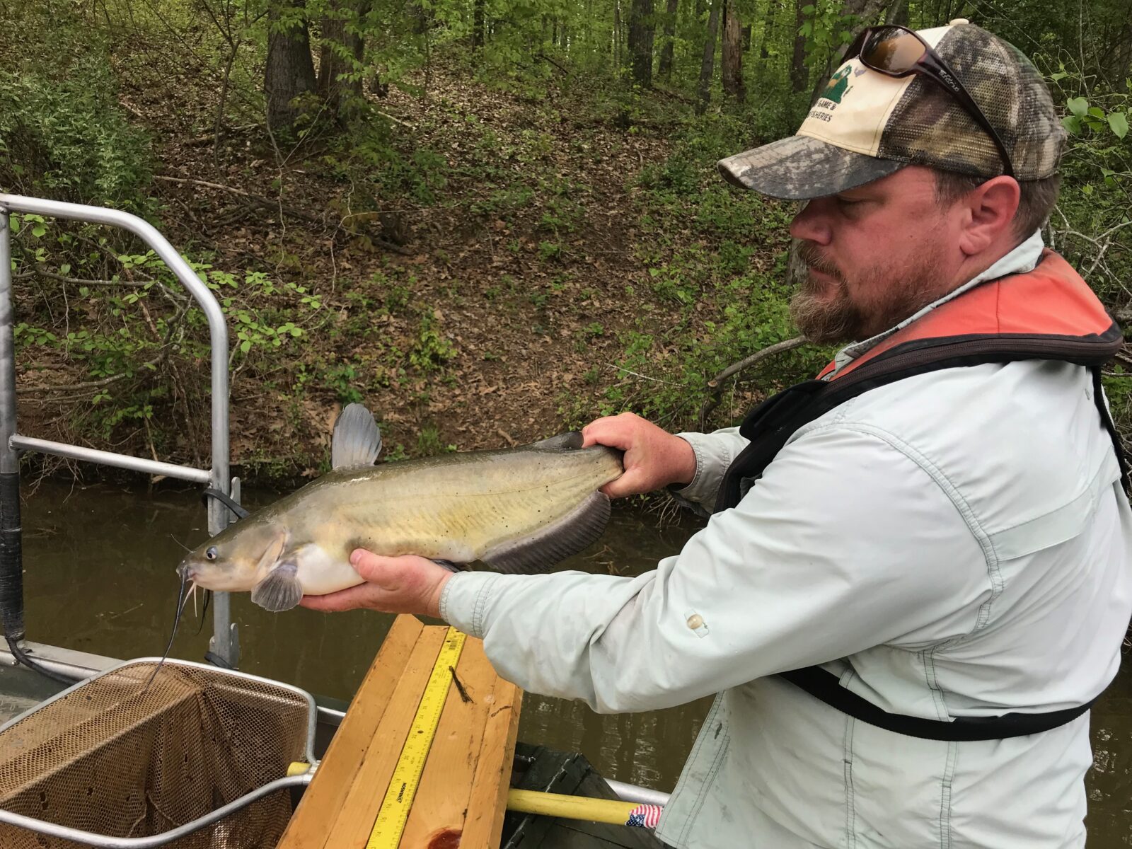 Le biologiste des pêches du district 4, Jonathan Harris, manipule une barbue de rivière pendant le traitement biologique.