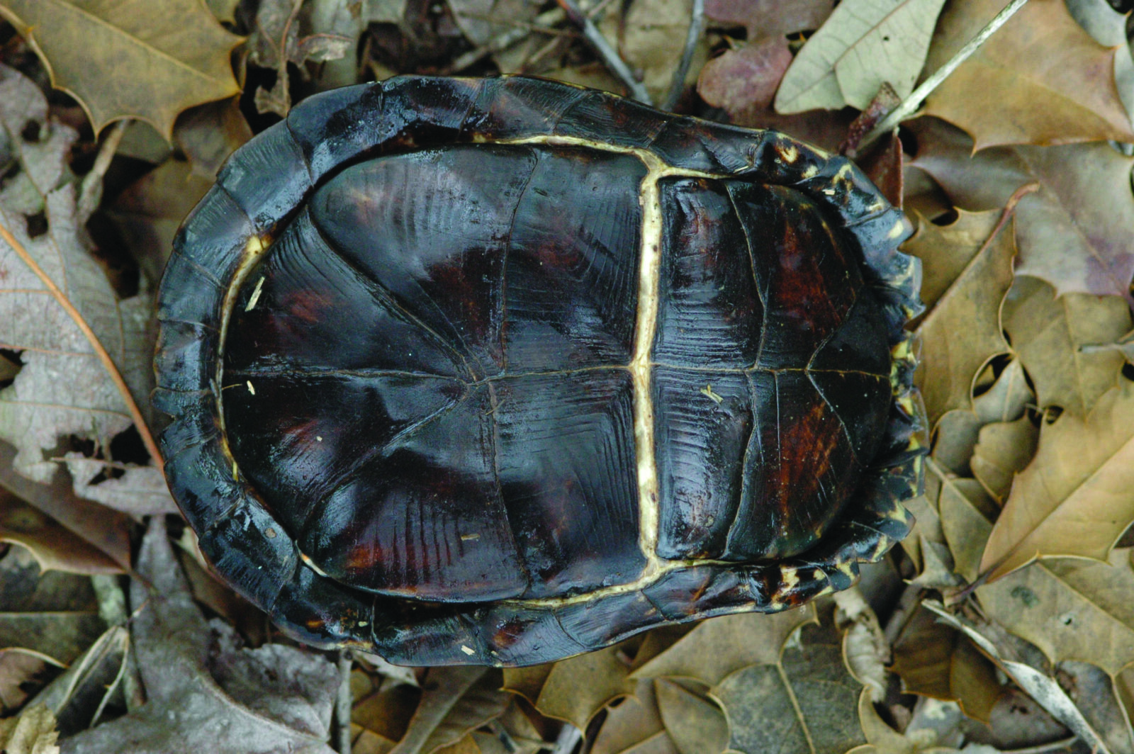 Carapace de tortue-boîte avec plaque à charnière indiquant leur nom visible. (c) JD Kleopfer
