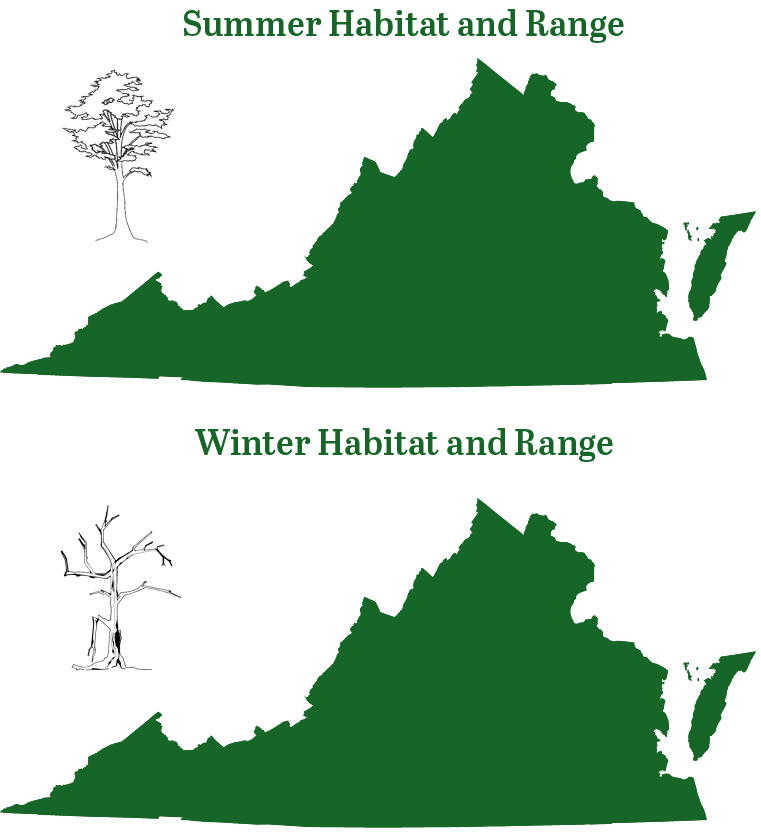 La chauve-souris rousse de l'Est est présente dans toute la Virginie et migre généralement à l'automne de son aire de répartition estivale septentrionale pour passer l'hiver dans le sud.