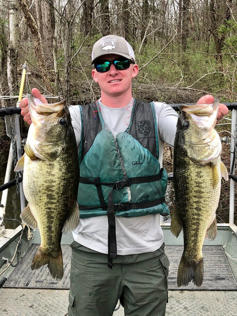Hunter Hatcher, biologiste des pêches de la région II, montre deux achigans à grande bouche collectés lors d'une enquête sur les communautés de poissons.