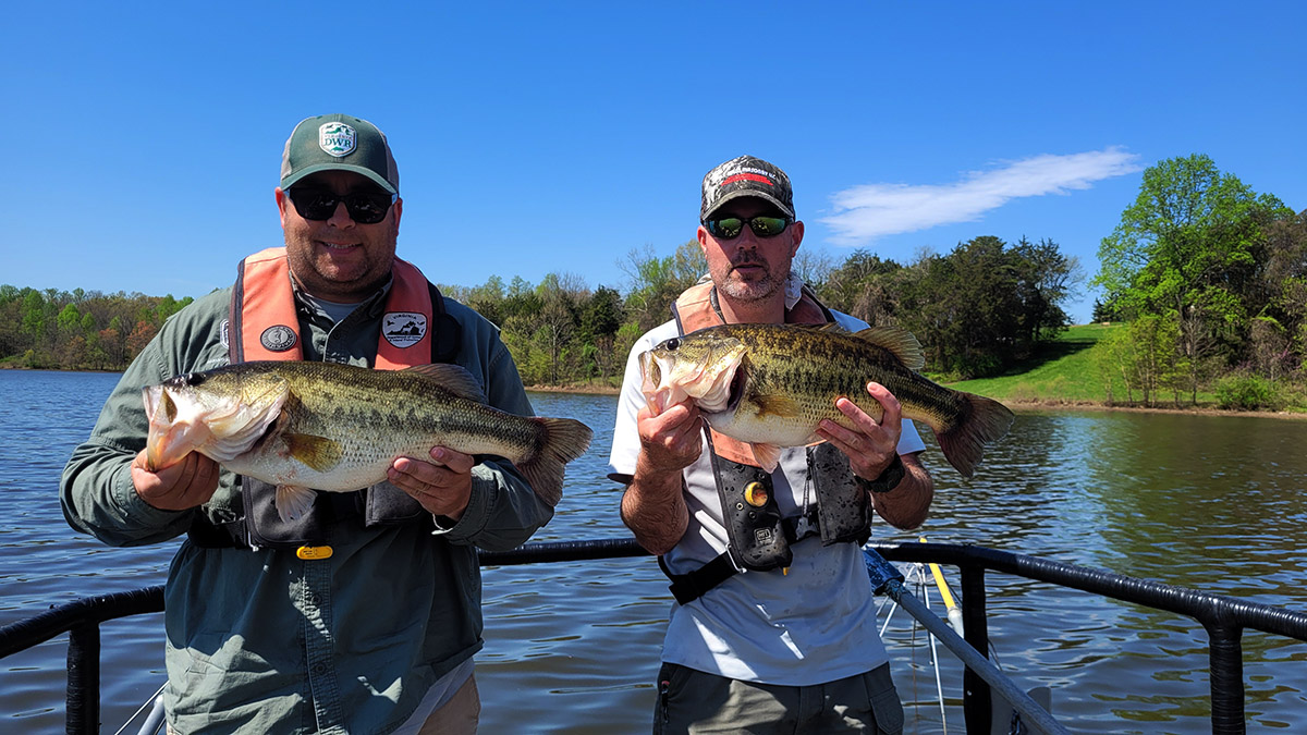 Mike Isel et Robbie Willis, biologistes des pêches de la région IV, montrent quelques beaux achigans à grande bouche prélevés lors d'une opération d'échantillonnage.