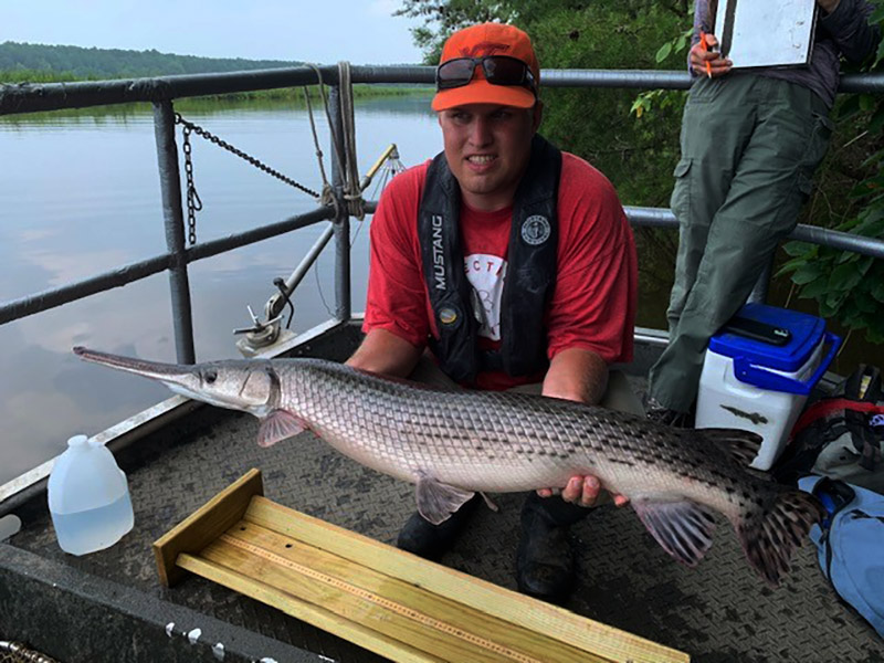 Des biologistes du DWR de Virginie traitent un grand lépisosté au cours de l'échantillonnage de la communauté de poissons. ©Scott Herrmann - DWR