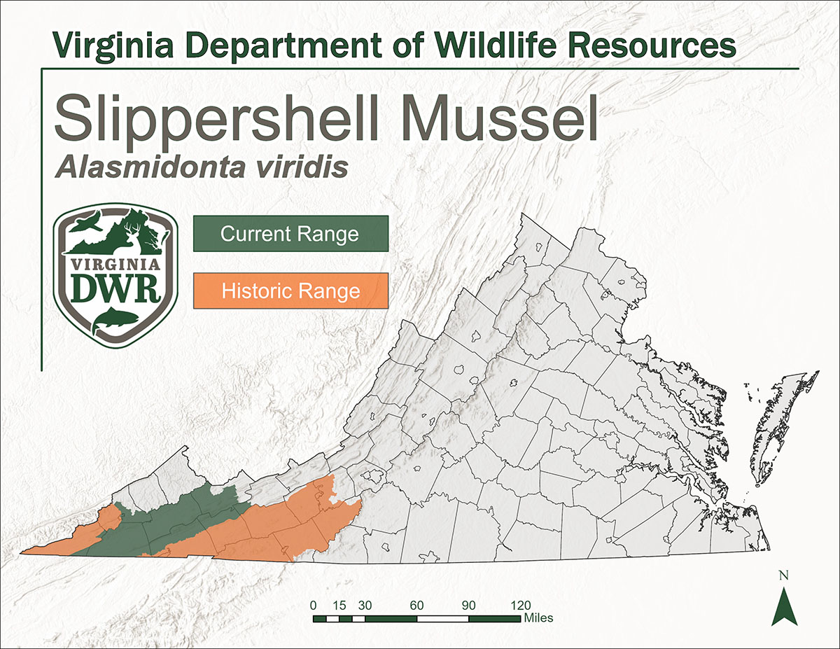 La moule à coquille a connu un déclin drastique dans toute la Virginie, et il ne reste plus que quelques petites populations. Le Centre de conservation de la faune aquatique (AWCC) du DWR travaille actuellement à la restauration de cette espèce dans le bassin supérieur de la rivière Tennessee, dans le sud-ouest de la Virginie.