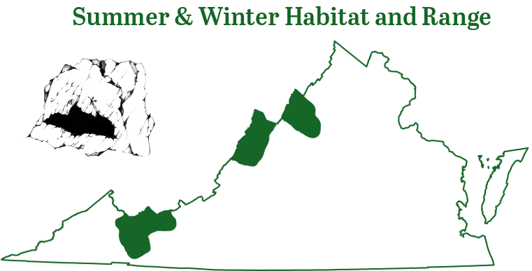 La chauve-souris à grandes oreilles de Virginie n'est présente que dans quelques comtés, dans des grottes tout au long de l'année, avec des sites d'hivernage souvent différents des sites de maternité d'été ou des gîtes de célibataires.