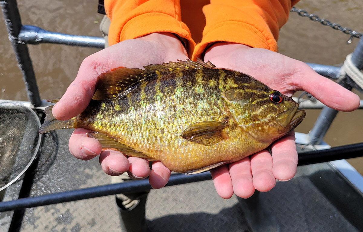 Un crapet-soleil de couleur foncée capturé lors d'une campagne de pêche à l'électricité.